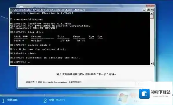 6、输入“clean”命令并按下“回车”键来请除您笔记本的硬盘中的所有分区及数据: