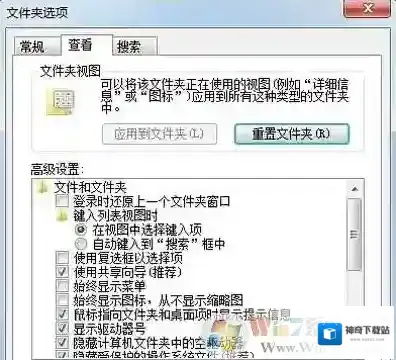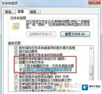 7、也可以打开任意一个文件夹→查看→选项→文件夹选项→查看→高级设置→取消:隐藏受保护的操作系统文件(推荐)前的选中对勾→再点选显示隐藏的文件、文件夹和驱动器→确定。