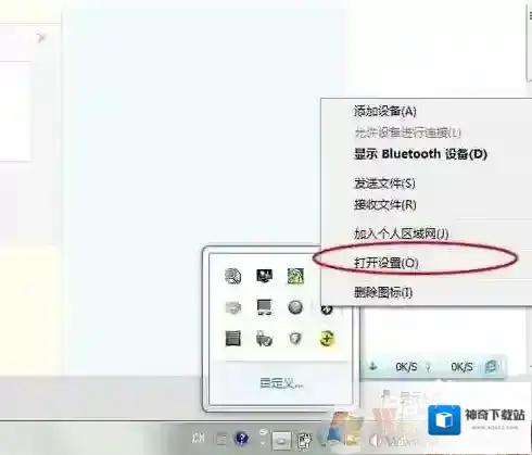 点击右下角的蓝牙图标后右击,就会出现蓝牙的设置功能,选择蓝牙设置。。Window7旗舰版