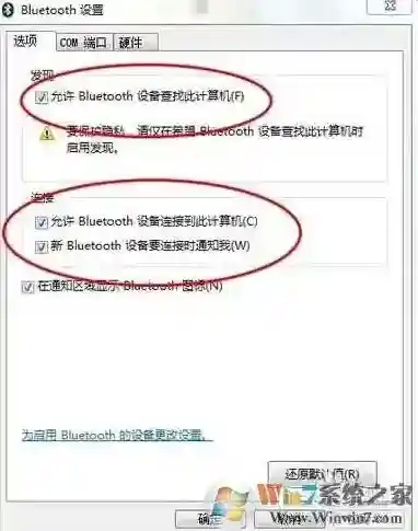 3、选择后就会出现蓝牙的设置界面,在选项选项卡中将允许蓝牙设备检测到勾选。然后在勾选下面的两个选项