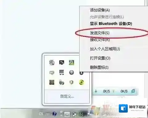 4、如果我们要发送文件的话那么我们必须打开蓝牙的发送文件功能才能进行共发送文件,打开发送文件的功能也很简单,右击右下角的蓝牙图标–选择发送文件–选择发送的设备–选择发送的文件。
