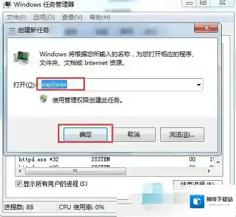 3、结束后,再点击“文件”–“新建任务(运行)”–输入“explorer.exe”回车;
