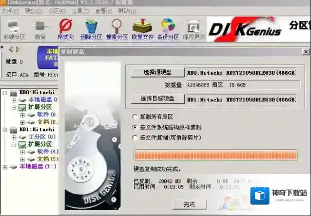 复制硬盘功能是指将一个硬盘的所有分区及分区内的文件和其它数据复制到另一个硬盘。复制过程中,本软件将按源硬盘中的分区结构,在目标硬盘上建立相同大小、相同类型的分区。然后逐一复制每个分区内的文件及数据。对于复制分区数据的过程,本软件提供了如下三种复制数据的方式:1、复制所有扇区:将源硬盘的所有扇区按从头到尾的顺序复制到目标硬盘。而不判断要复制的扇区中是否存在有效数据。此方式会复制大量的无用数据,要复制的数据量较大,因此复制速度较慢。但这是最完整的复制方式,会将源硬盘数据“不折不扣”地复制到目标硬盘。2、按文件系统结构原样复制:按每一个源分区的数据组织结构将数据“原样”复制到目标硬盘的对应分区。复制后目标分区中的数据组织结构与源分区完全相同。复制时会排除掉无效扇区。因为只复制有效扇区,所以用这种方式复制硬盘速度最快。3、按文件复制:通过分析源硬盘中每一个分区的文件数据组织结构,将源硬盘分区中的所有文件复制到目标硬盘的对应分区。复制时会将目标分区中的文件按文件系统结构的要求重新组织。用此方式复制硬盘后,目标分区将没有文件碎片,复制速度也比较快。