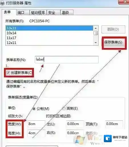 4、单击创建 “新表单”,为新表单命名,输入直尺量测好的宽度、高度, 7寸照片纸的大小是 178高 127宽 单位 mm 然后点击 “保存表单”即可,见下图。