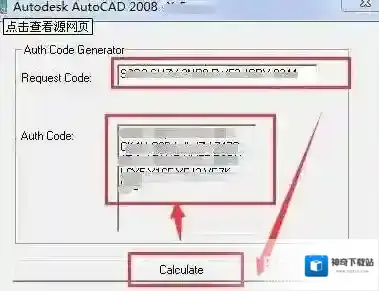 8、然后将下载的注册机2008打开(一定要放在CAD2008的安装文件中)。然后按正常步骤走就好。复制申请号–粘贴到注册机,点击“Calculate”,就生成激活码。