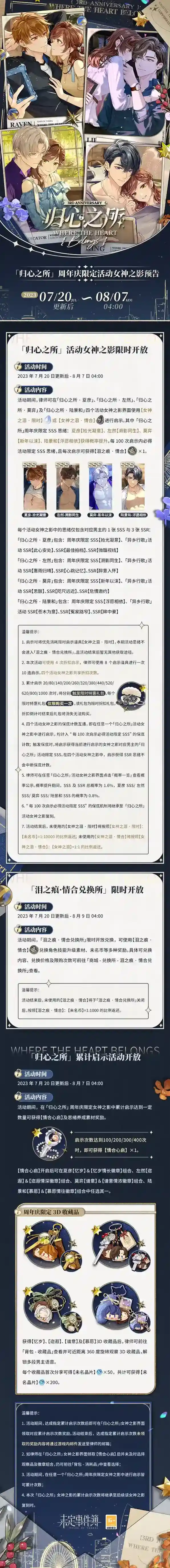 活动期间,在「归心之所」周年庆限定女神之影中累计启示达到一定数量可获得情合心启及思绪养成素材奖励。启示次数达到100/200/300/400次时,即可获得情合心启×1;情合心启开启后可在夏彦忆岁 忆岁情长徽章组合、左然迩遐 迩遐情深徽章组合、莫弈谱意 谱意情浓徽章组合、陆景和慕愿 慕愿情往徽章组合中任选其一。忆岁、迩遐、谱意及慕愿为周年庆限定3d收藏品,律师可前往「背包-收藏品」查看并可近距离360度旋转观察3d收藏品,解锁多段男主语音