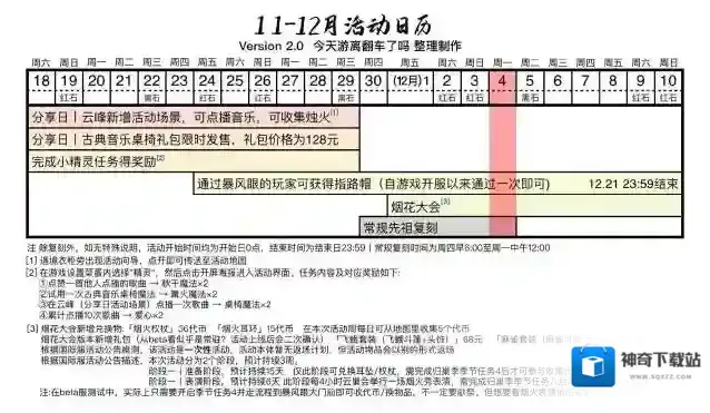 图1今日烟花代币位置图2今日季节蜡烛(云野)图3今日任务详解图4今日大蜡烛点(霞谷)图5烟花大会攻略图(含兑换物品位置)图6近期活动日历=『每日任务』=「接受一份礼物」收一颗心或心火「在云野重温先祖的美好回忆」云野图一昨天半球形小山包顶「拯救一只遥鲲」烧掉困住遥鲲的花「在锦鲤池冥想」在云野神庙门口池塘右岸边的石碑前光圈处打坐并留言=『烟花大会·Day4』=需走完归巢季季节任务4献祭前流程才能看到代币(可以不献祭)今日可获得烟花币(5枚),其中→云巢地图直接收集:4枚→帮助先祖在雨林收集材料后出现:1枚注:需在云巢魔法商铺门口点击感叹号后再去晨岛才能触发任务截止至今日已获得烟花币:20枚=『落石点』=今日无黑/红石=『日程提醒』=?.遇境魔法船免费魔法:(每周一)烟花魔法(烟花大会一次性)文雀礼包试用魔法、飞蛾礼包试用魔法?.归巢季开始啦?.小王子季丨萎靡不振的士兵将于中午12:00离开