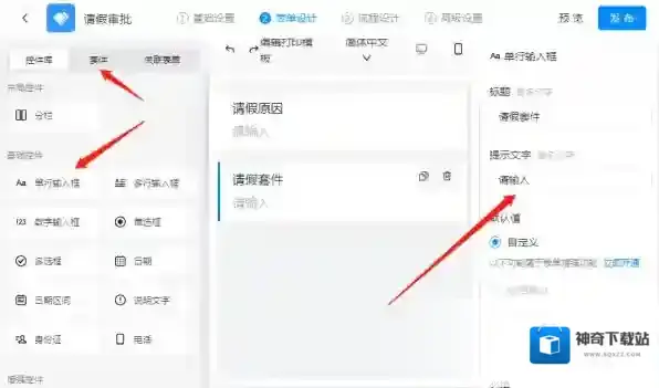 4. 点击上方表单设计,然后我们添加请假原因、请假证明、请假套件等等;