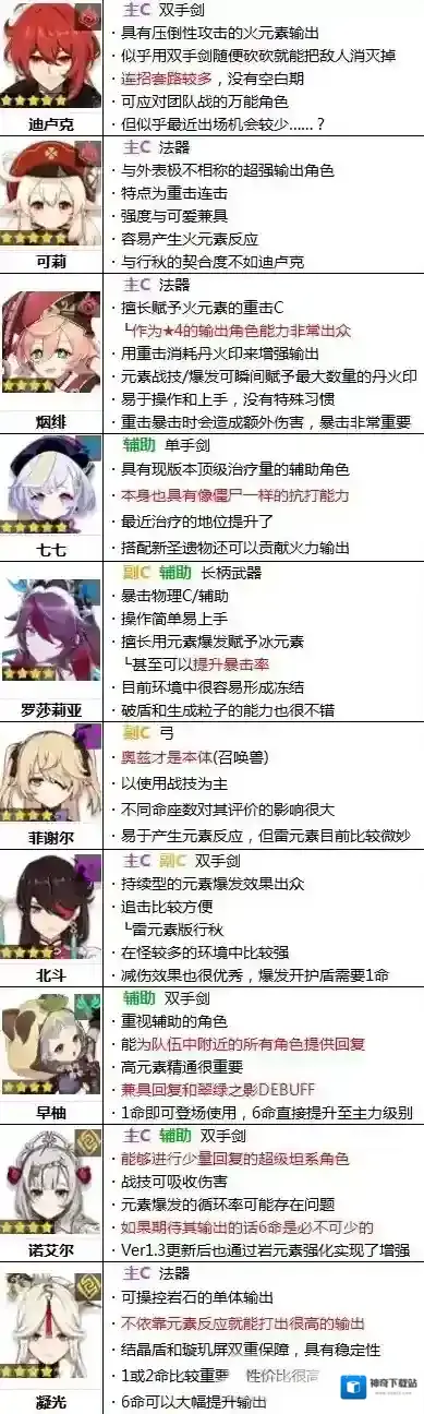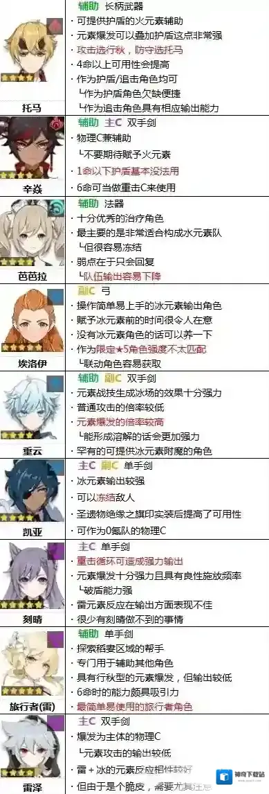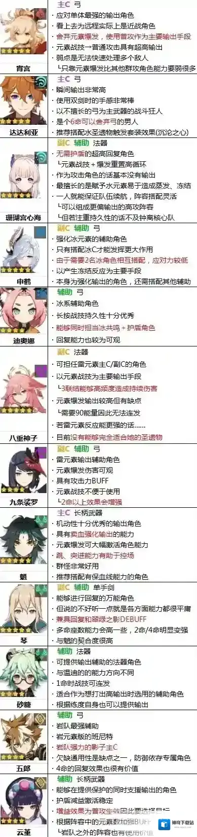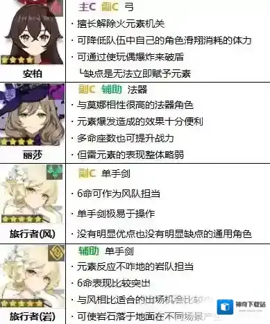 副C是专注于元素战技或元素爆发,可以通过元素反应造成伤害的角色。具有容易引发元素反应的设置型技能或常驻技能越多,排名越靠前。