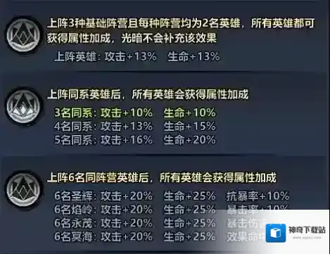 当上阵的英雄为同系英雄时,相同羁绊英雄之间将会获得额外属性加成效果。随着同系英雄的上阵人数增加,相关英雄所获得的羁绊属性加成也会随着提升。