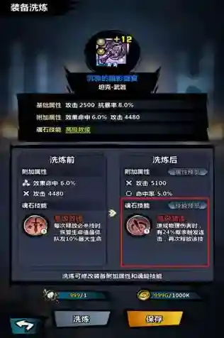 3、如果对获取的装备技能不满意,可以使用洗练功能对装备技能进行重置,重置范围固定在装备原来给出6个初始技能之间随机选择,洗练需要消耗洗练石与金币