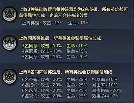 当我方英雄阵营克制目标时,将会提高暴击、触发强击以及提升伤害,反之,若被克制时,将会减少暴击、触发弱击以及降低伤害。