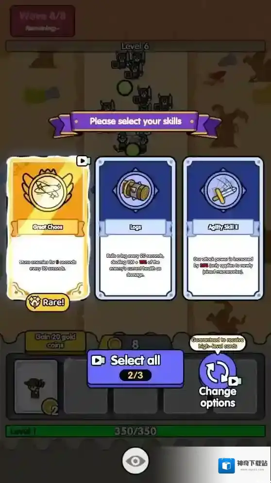 3、召唤不同的小兵需要的金币数量是不一样的,当击败敌人后会获得经验,提升等级后可以选择一个技能来强化小兵。