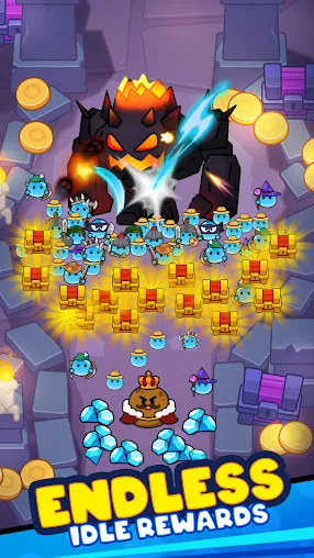 1、通过无止尽的放置战斗,让你的史莱姆大军们消灭一个又一个怪物,收集奖励提升你的实力。