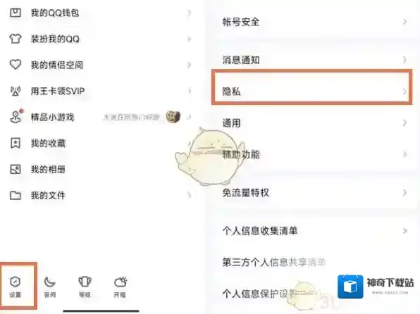 1、打开QQ,点击左上角头像。点击设置,选择隐私。