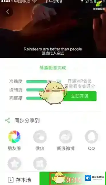 点击“发布并分享”后进入分享页面,同时视频正在上传至趣配音应用平台。你可以选择讲自己的视频分享至社交平台,秀秀你的英语口语。