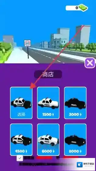 2、进入商店界面,可选择已拥有的警车(如第一个“选择”),或花费金币购买其他警车,驾驶对应警车执行道路任务。