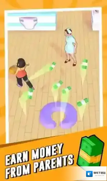 2、操控护士角色,跟随地上的绿色钞票指引,移动到对应区域(如放有尿布的桌子旁),完成物品收集或准备,为照顾孩子做准备,推进任务进度。