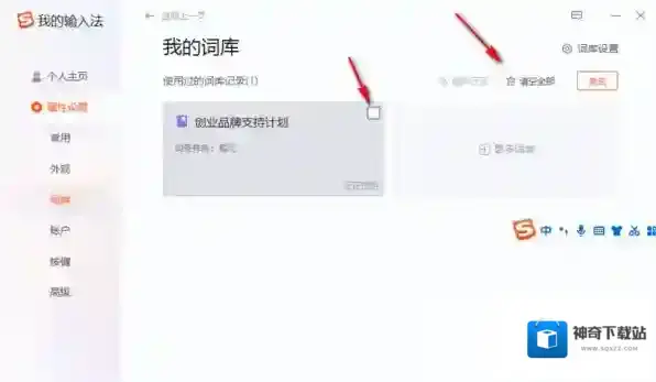 5,这时候就可以看到之前下载的词库内容了,如果想要完全删除的话,点击“清空全部”即可,也可以针对性的进行删除,勾选上右上角的小方块,进行批量删除即可。