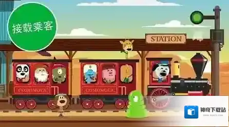 2、进入火车站场景,根据“接载乘客”的提示,让火车停靠在站台边,搭载不同的动物乘客如熊猫、圣诞老人、长颈鹿等上车,完成乘客接载任务。
