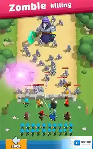 1、战斗时,操控英雄释放紫色范围技能,清理前方敌方(如灰色士兵),为部队开辟路径。