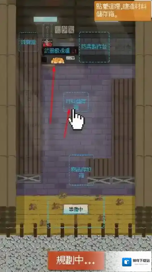 1、“建造工坊”,在工坊区域建造材料储存箱、武器锻造炉等建筑,规划生产布局。