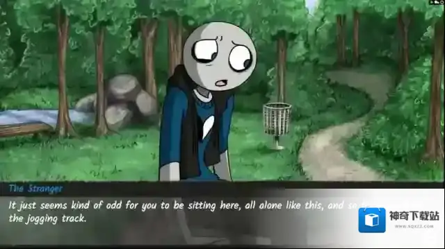 3、呈现了特定场景及对话文本他坐在板凳上盯着我,但我看不懂他的表情,属于剧情推进中的一个情节片段,用于营造故事氛围、推动互动解谜等流程。