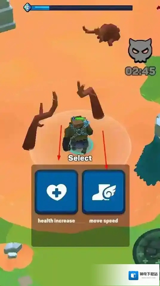 2、“战斗技能选择”,战斗中弹出技能选项,选择提升生命或移速,增强战斗能力。