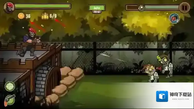 3、“防御阵地”,利用武器(手枪、炸弹),阻止多波僵尸靠近堡垒,守护生存区域。
