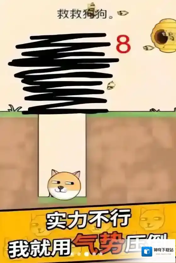 3、第2关蜜蜂从蜂窝飞出,沿箭头方向,画更封闭的线(包围狗狗与平台),隔绝蜜蜂,保护狗狗通关。
