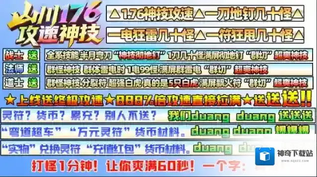 山川176攻速神技,三职业微变神器版本,丰富大陆任你探索,超强BUFF任你搭配!本服主打三职业平衡,各种丝滑神技、BUFF可以自由搭配,打造属于你的专属玩法!游戏内装备、材料和货币全靠爆,红包、灵符、实物到处都爆,时间等于本服一切,只要你打的快、爆率高,没有什么是你得不到的!花时间人人都能够追梦,散人也可以逆袭当大哥!