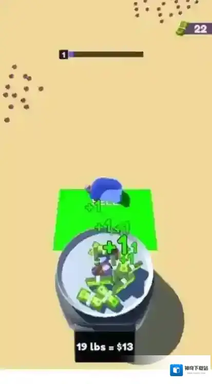 3、将装有小球的容器拖到绿色“SELL”区域的秤上,秤会显示小球重量(如6lbs),完成售卖获取金币,通过售卖小球变现,用金币去升级容器。