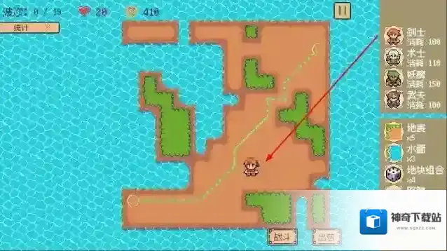 1、“兵种部署”,消耗金币,在岛屿路径布置剑士、术士等兵种,构建防御线。