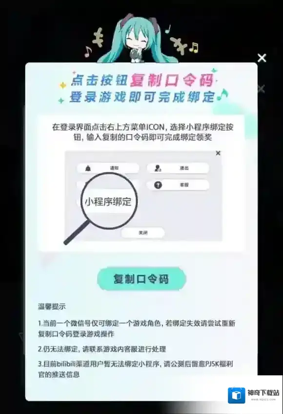 5、请点击小程序绑定,将已复制的口令码粘贴绑定操作即可。