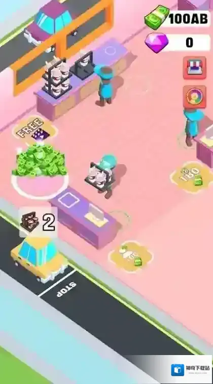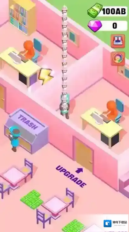 3、呈现办公场所场景,有角色、货币(100AB)、钻石(0)、“UPGRADE(升级)”提示等,玩法应是经营管理空间、升级设施、服务角色,属于休闲益智的模拟经营品类。