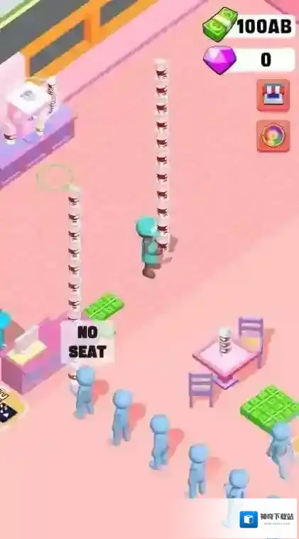 1、显示NOSEAT角色、货币(100AB)、钻石等元素,属于休闲益智的解压,玩法是经营餐厅、安排顾客就座等。