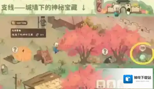 2、支线任务2:城墙下的神秘宝藏,来到城墙下方,如图所示的位置桃花树右边可以找到宝藏。