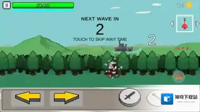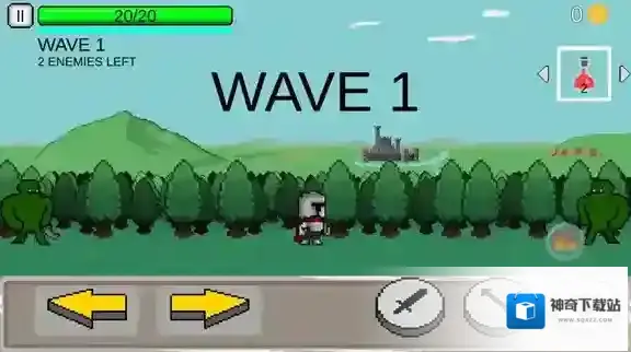 2、进入关卡后点击左侧的按钮控制角色移动,右侧的按钮是使用长剑、弓箭、防御。