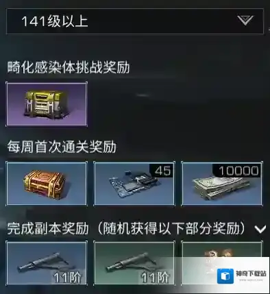 (珍贵资源奖励为当前等级装备制作材料)45分钟内击败特殊感染体通关副本即可获得畸化感染者挑战奖励(战斗熟练度奖励)每周首次通关奖励、配件、通用组件、特殊组件更有机会开启无主的宝箱评级奖励