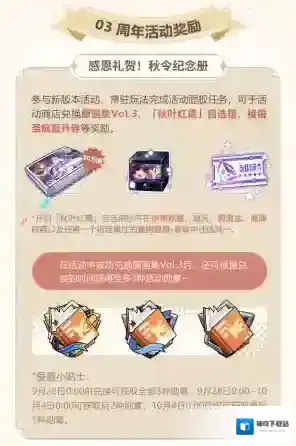参与新版本活动、常驻玩法完成活动面板任务,可于活动商店兑换原画集Vol.3、「秋叶红霜」自选箱、棱镜圣痕直升券等奖励。