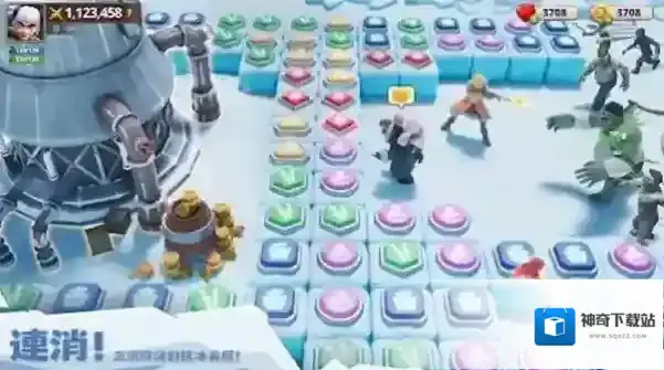 2、在消除界面,连消同色方块(红箭头),触发技能,协助战斗,突破“冰封冰层”。
