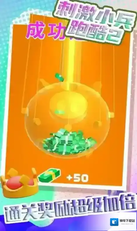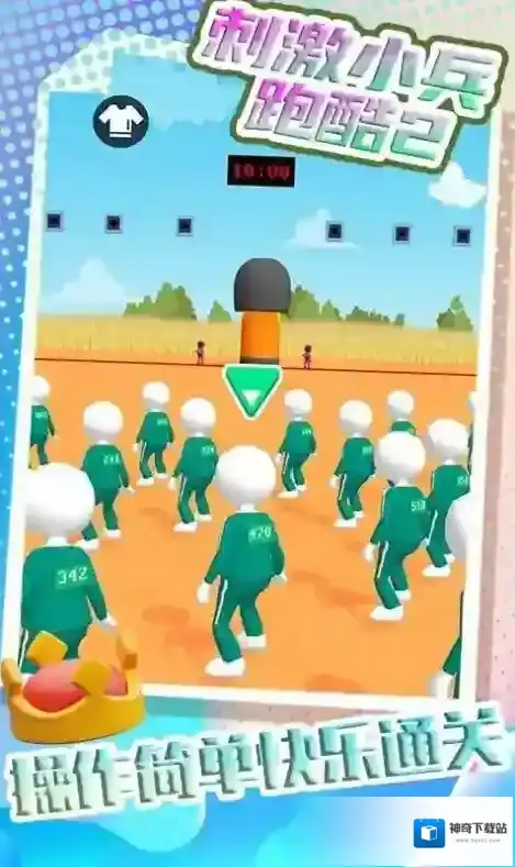 3、关卡中,跟随绿色箭头,指挥小兵(绿色)移动,躲避“鱿鱼游戏”风格挑战(如123木头人),通关积累金币。