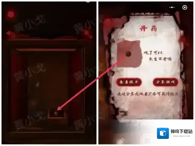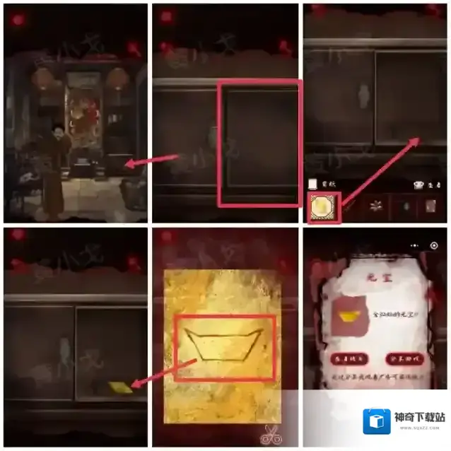 12.先点击桌子上的点心,出现纸人。点击柜子,打开右侧柜门,把黄纸放到红色框内,用剪刀剪下元宝