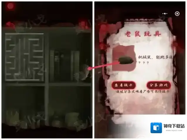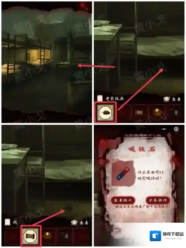 8.点击右侧床铺,用老鼠玩具和线把吸铁石取出来