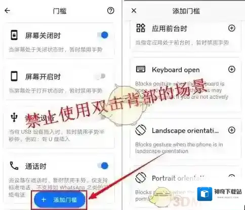 6、“门槛”就是当手机处于某些场景中时将禁止使用双击背部功能,比如可以设置熄屏、通话、打开键盘、打开某个应用等时将禁止使用双击背部功能,如下图所示: