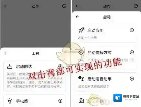 5、除了展开通知,还可以设置双击背部启动某个应用、启用语音助手、截图、锁屏、调节音量等,如下图所示: