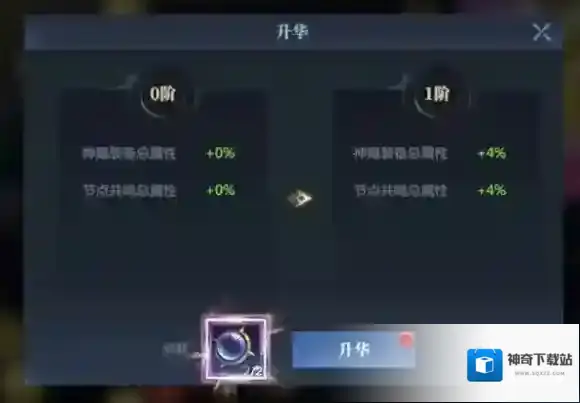 可以消耗神谕之兆来提升神赐升华等级。提升后,已穿戴的神赐装备的属性和节点共鸣的固定值属性将按百分比提高。若孔位未穿戴神赐装备,则加成属性不生效。