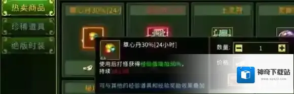 2、购买草心丹,使用草心丹可以在24小时内提升30%打怪获得的经验,而且其效果可以与其他经验道具和经验奖励叠加。