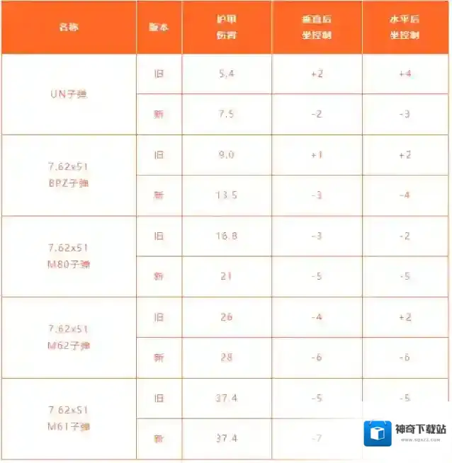 7.62×39毫米HP子弹同样移除了后坐控制属性另外,我们对大部分7.62×51毫米的子弹也进行了一些调整,整体的调整逻辑是增强了对护甲的耐久损耗,但是后坐力变得更加不可控。也就是说,能更快地消耗护甲的耐久值,但连发会更难压枪。具体调整的数值,老皮给大家放一个表格来看一下。