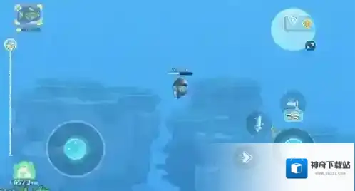 使用左侧摇杆控制角色移动,右侧按钮发射鱼叉捕鱼,注意角色氧气条,在耗尽前需返回水面。